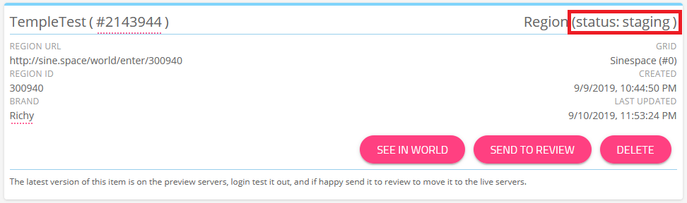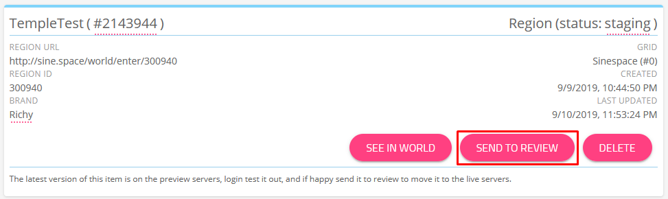 When you are happy with how your content looks in-world on the preview server, you can then go ahead and send your content for review by our review team.