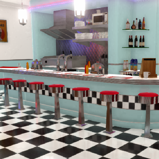Small 50's hot rod and rock n roll retro corner diner ready for the crowd. Decorated with gas pumps and car parts. Grab your best 50's retro outfit and bring all your friends
